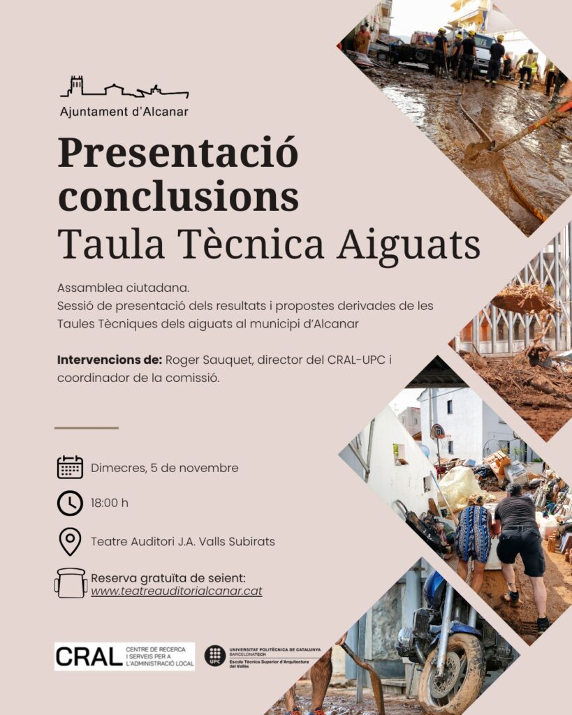 L’acte comptarà amb la intervenció de Roger Sauquet, director del Centre de Recerca i Serveis per a l’Administració Local (CRAL-UPC) i coordinador de la comissió. Durant la sessió, es presentaran els resultats i propostes derivats de les Taules Tècniques que han analitzat els aiguats ocorreguts a Alcanar els anys 2018, 2021 i 2023.