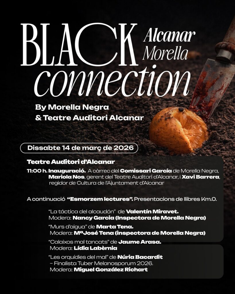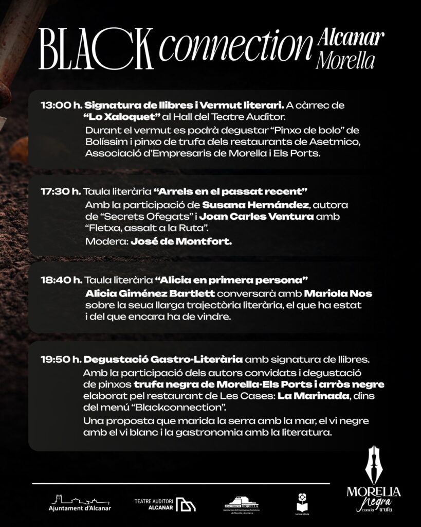 El 14 de març de 2026 tindrà lloc en el Teatre Auditori d’Alcanar el II Blackconnection Alcanar-Morella, el festival Gastro-Literari que va nàixer de la mà de Morella Negra i el Teatre Auditori. Un esdeveniment que, fusionant la literatura amb la gastronomia, vol potenciar i donar a conéixer autors de l’àmbit de la llegua catalana, de Catalunya i València, al bell mig del territori, lloc de frontera inexistent que per nosaltres és unió de la mateixa gent.