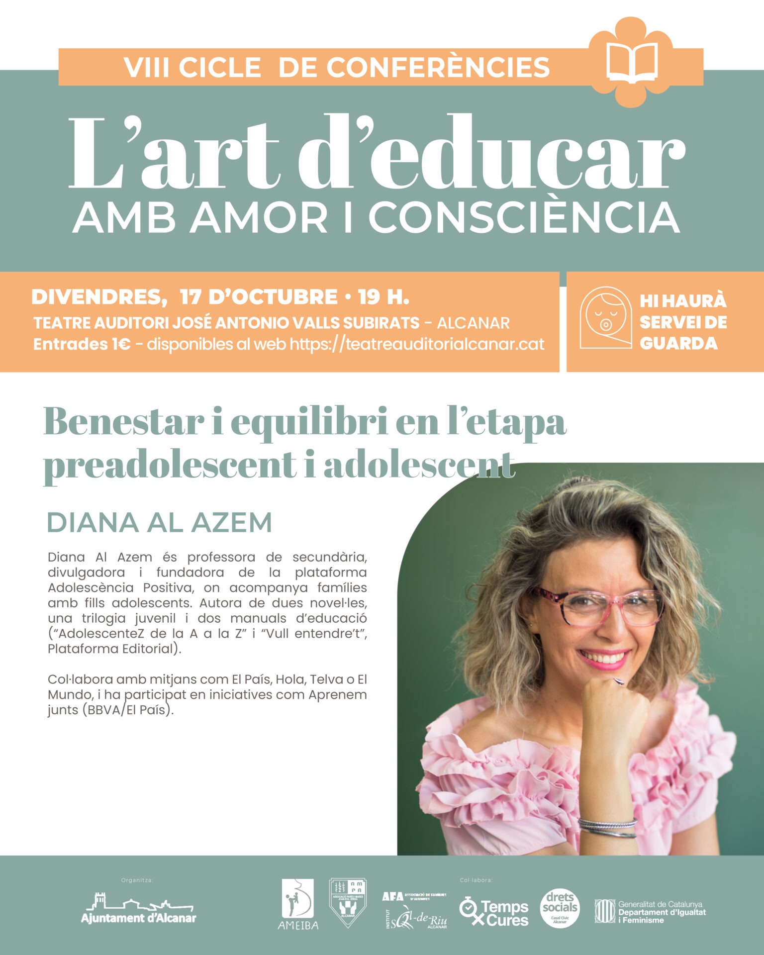 Diana Al Azem és professora de secundària, divulgadora i fundadora de la plataforma Adolescència Positiva, on acompanya famílies amb fills adolescents. Autora de dues novel·les, una trilogia juvenil i dos manuals d’educació (“AdolescenteZ de la A a la Z” i “Vull entendre’t”, Plataforma Editorial). Col·labora amb mitjans com El País, Hola, Telva o El Mundo, i ha participat en iniciatives com Aprenem junts (BBVA/El País).