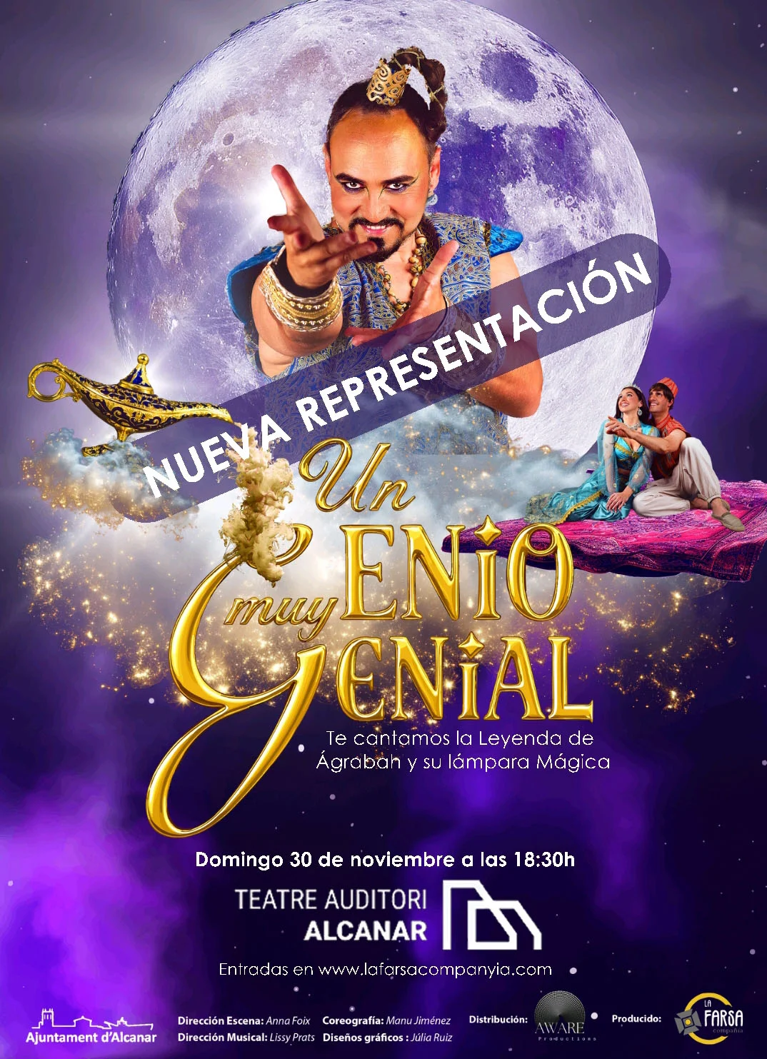 “Un Geni molt genial” ens conta la història d’un jove lladre anomenat Aladdín que troba el llum màgic, però, aquesta vegada, és el Geni el veritable motor del conte. Ell ajudarà al fet que els camins de Aladdín i la Princesa Gessamí s’uneixin i que els foscos plans del malvat Jafar no arribin a la seva fi. Entre catifes voladores, palaus encantats i desitjos, aquesta comèdia musical posa en el centre a qui sempre ha estat al marge: l’ànima més poderosa i també més solitària de Ágrabah.