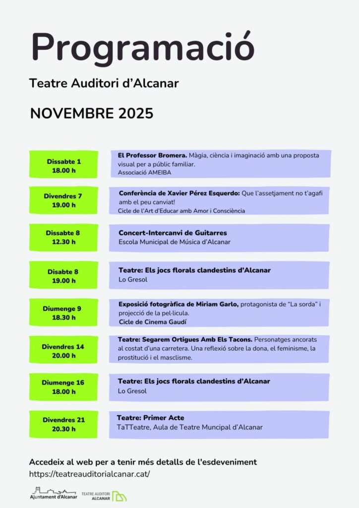 El Teatre Auditori d’Alcanar continua, un mes més, amb una programació variada i per a tots els públics. Novembre arriba ple de propostes teatrals, musicals i culturals que esperem siguen del vostre grat.